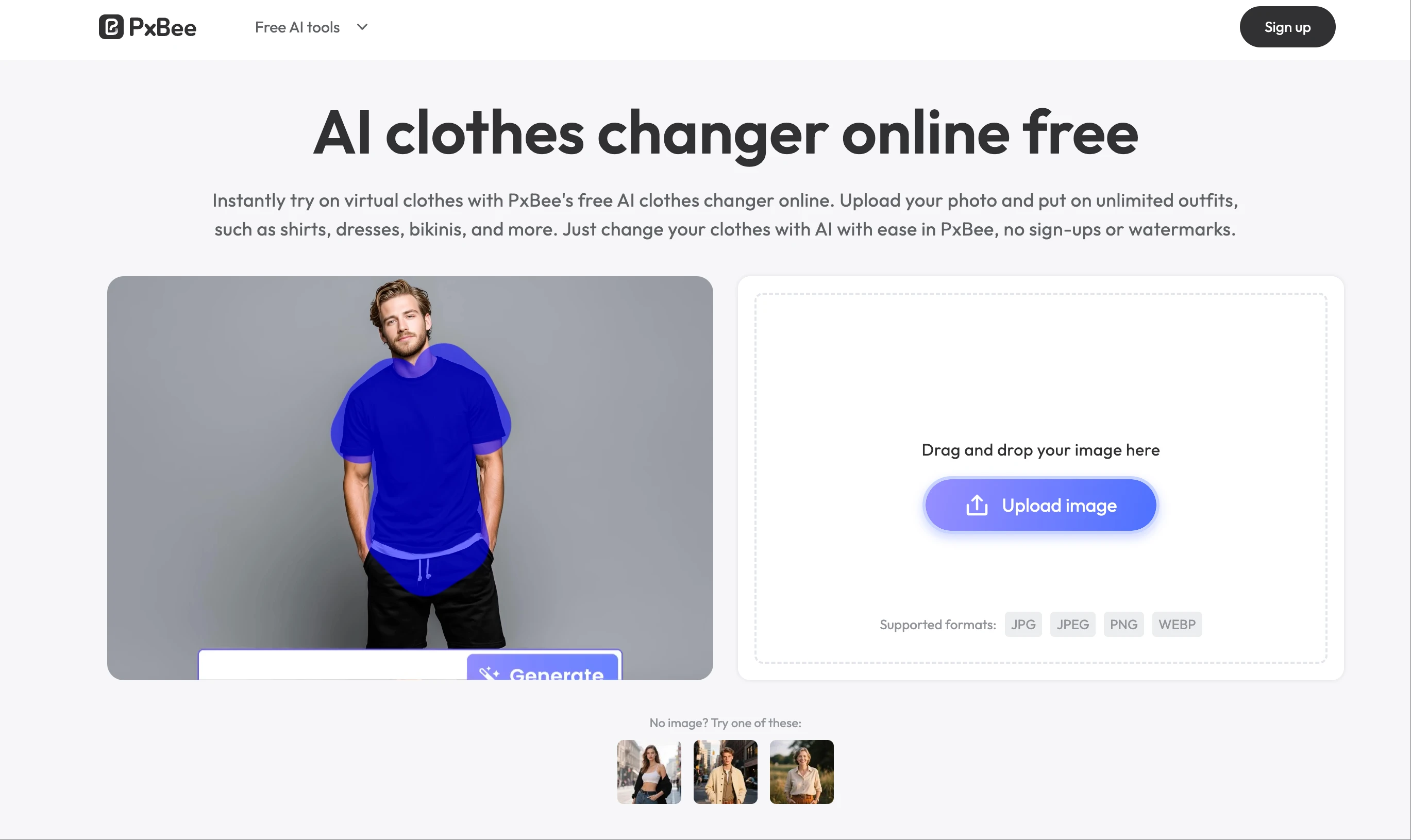 PxBee offers a flexible ai clothes changer with both brush-based region selection and prompt-generated outfits. You can try different fashion styles—from casual to luxury to cosplay—making it a powerful tool for creative users. It’s fully web-based and works as a beginner-friendly photo editing tool for outfit transformations.